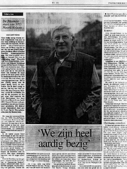 ‘Een tijdje geleden waren enkele jeugdleden van ons op een vrijdagmiddag in Heerenveen aan het trainen. De bekende marathonschaatser Jeen van de Berg zag dat en zei, dat we een goede jeugdgroep hebben. Mooi allemaal dezelfde trainingspakken aan. Dat doet je goed, wanneer zo iemand dat over je vereniging zegt.’ Woorden van Aart Steenbergen, voorzitter van Schaats Trainings Groep (STG) Noord-Veluwe. Hij is een tevreden man. Zijn vereniging bestaat nu anderhalf jaar en in die periode heeft het bestuur de zaak goed op de rails gezet, zoals de Hattemerbroeker het zelf uitdrukt. En niet alleen qua verenigingsstructuur. ‘Het is een cliché, maar wie de jeugd heeft, heeft de toekomst. En ik durf rustig te stellen, dat wij een hele talentvolle pupillengroep hebben,’ aldus de voorzitter. En ook bij de senioren zit het wel snor. Met mannen als Erik Meijhuizen, Jan Aart Schuld en Henk Groen heeft STG Noord-Veluwe schaatsenrijders van niveau binnen haar gelederen. Dit drietal neemt binnenkort deel aan de Super Sprint Kampioenschappen in Heerenveen.