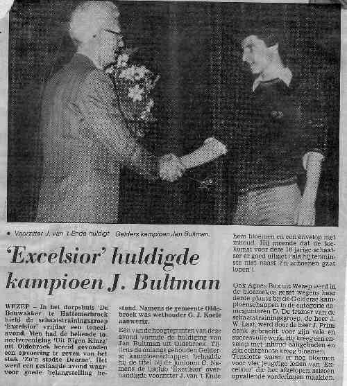 ![]() Voorzitter J. van ’t Ende huldigt Gelders kampioen Jan Bultman. Wezep – In het dorpshuis ‘De Bouwakker’ te Hattemerbroek hield de schaatstrainingsgroep ‘Excelsior’vrijdag een toneelavond. Men had de bekende toneelvereniging ‘Uit Eigen Kring’ uit Oldebroek bereid gevonden een opvoering te geven van het stuk ‘Zo’n stadse Deerne’. Het werd een geslaagde avond waar voor goede belangstelling bestond. Namens de gemeente was wethouder G.J. Koele aanwezig. Eén van de hoogtepunten van deze avond vormde de huldiging van Jan Bultman uit Oldebroek. Tijdens de onlangs gehouden Gelderse kampioenschappen behaalde hij de titel bij de junioren C. Namens de ijsclub ‘Excelsior’ overhandigde voorzitter J. van ’t Ende hem bloemen en een envelop met inhoud. Hij meende dat de toekomst voor deze 16-jarige schaatser er goed uitziet (‘als hij tenminste niet naast z’n schoenen gaat lopen’). Ook Agnes Bax uit Wezep werd in de bloemetjes gezet wegens haar derde plaats bij de Gelderse kampioenschappen in de categorie damesjunioren D. De trainer van de schaatstrainingsgroep, de heer J.W. Last, werd door de heer J. Prins dank gebracht voor zijn vele en succesvolle werk. Hij kreeg een envelop met inhoud aangeboden en zijn echtgenote kreeg bloemen. ^ back to index ^